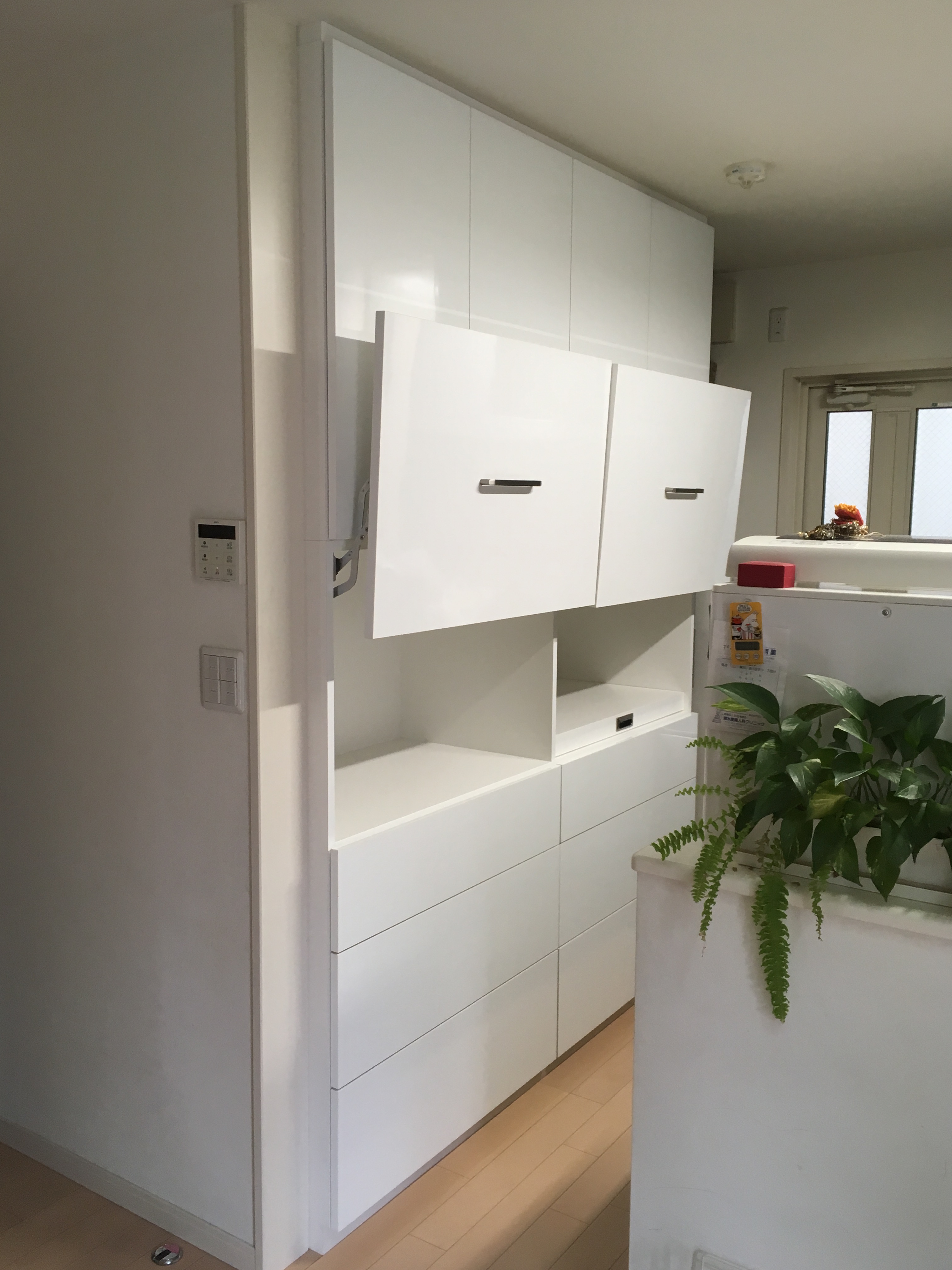 寸法:幅1750×奥行540×高さ2400 スイングリフトアップ扉付き鏡面のカップボードです。 既製品のカップボードと入れ替えでしたが、 見比べて見るとやはり断然オーダーの方が 見た目もクオリテイ高いです! まぁ、お値段も比べものにはなりませんが...。 でも、20年、30年と飽きるまで使えますよ! 既製品は悲しい事に大型ごみへと。 今回はありがとうございました! またの機会をお待ちしております。 |  |